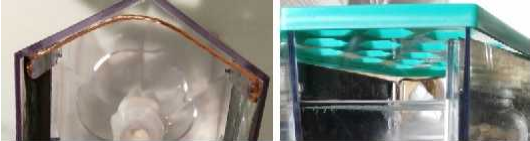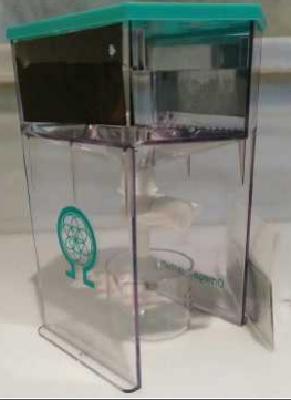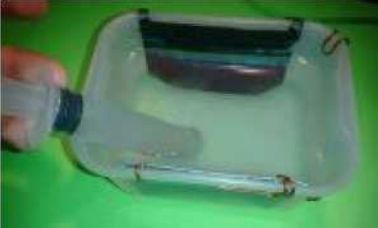 6. En este paso vertemos la solución salina; tenemos dos opciones: a. Agua de mar filtrada de impurezas. Preparamos la solución con 45g de sal por 450ml de agua, la mezclamos hasta disolverse la sal y vertemos en el recipiente.
