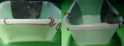 (*imágenes que muestran la conexión i magen izquierda y la ubicación del cable fuera de la solución salina una vez vertida en el recipiente imagen derecha )